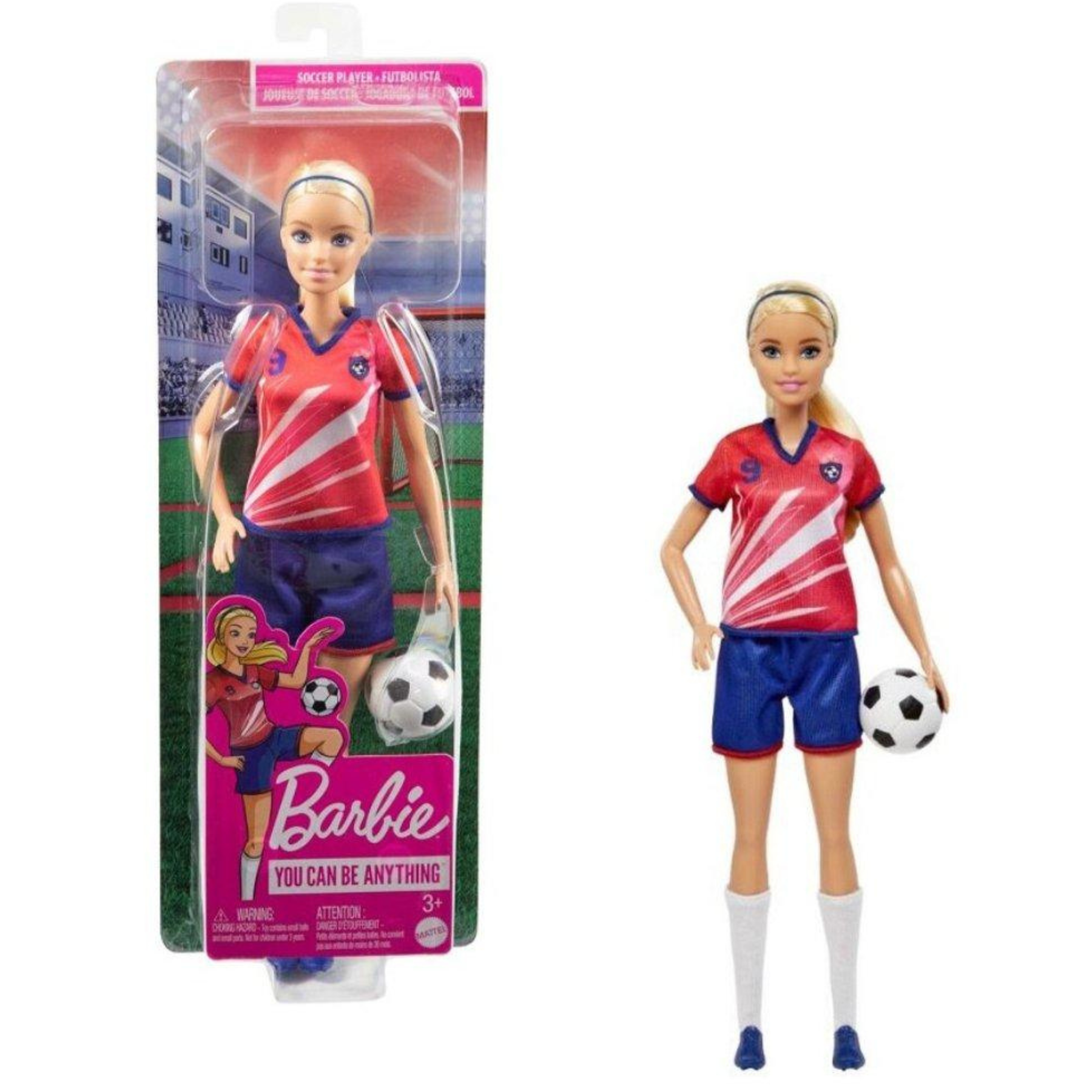 Celebra uno de los deportes más queridos con esta muñeca Barbie de fútbol. Esta muñeca de 29 cm luce un uniforme inspirado en una paleta de colores mundialmente popular. Lleva una camiseta roja con rayas blancas, el número 9 y el escudo del equipo, además de pantalones cortos azules, zapatos con tachuelas y calcetines blancos, lista para marcar. Tiene el pelo rubio recogido en una coleta e incluye un balón de fútbol. ¡Un regalo ideal para niñas a partir de 3 años, especialmente para las aficionadas al fútbol, los deportes y el fitness!