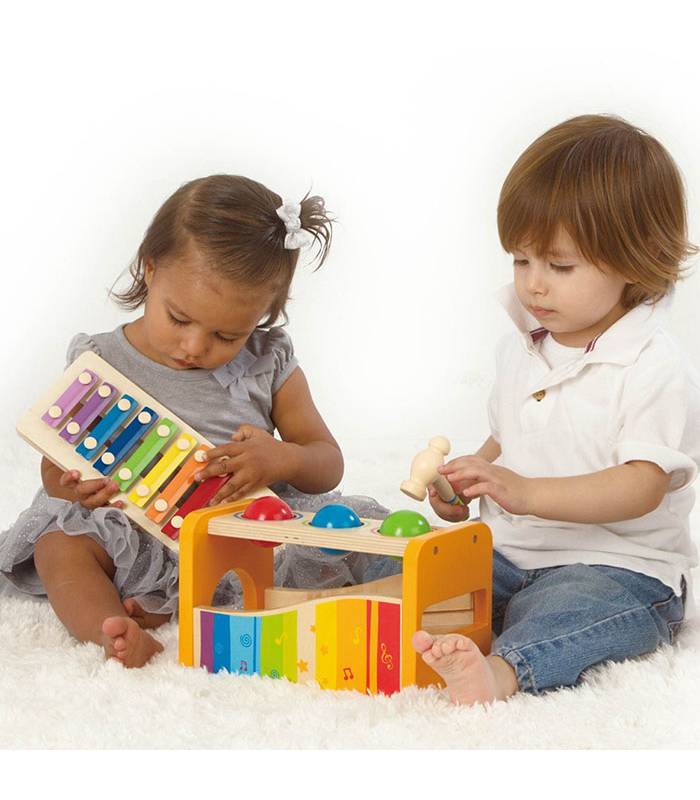 Este xilófono combina juego y aprendizaje sensorial. Al golpear las pelotas, estas caen sobre las teclas, produciendo sonidos que enseñan causa y efecto. Fomenta la motricidad fina, la exploración musical y el reconocimiento de colores. Perfecto para descubrir la relación entre el movimiento y el sonido. Edad: +1 año.