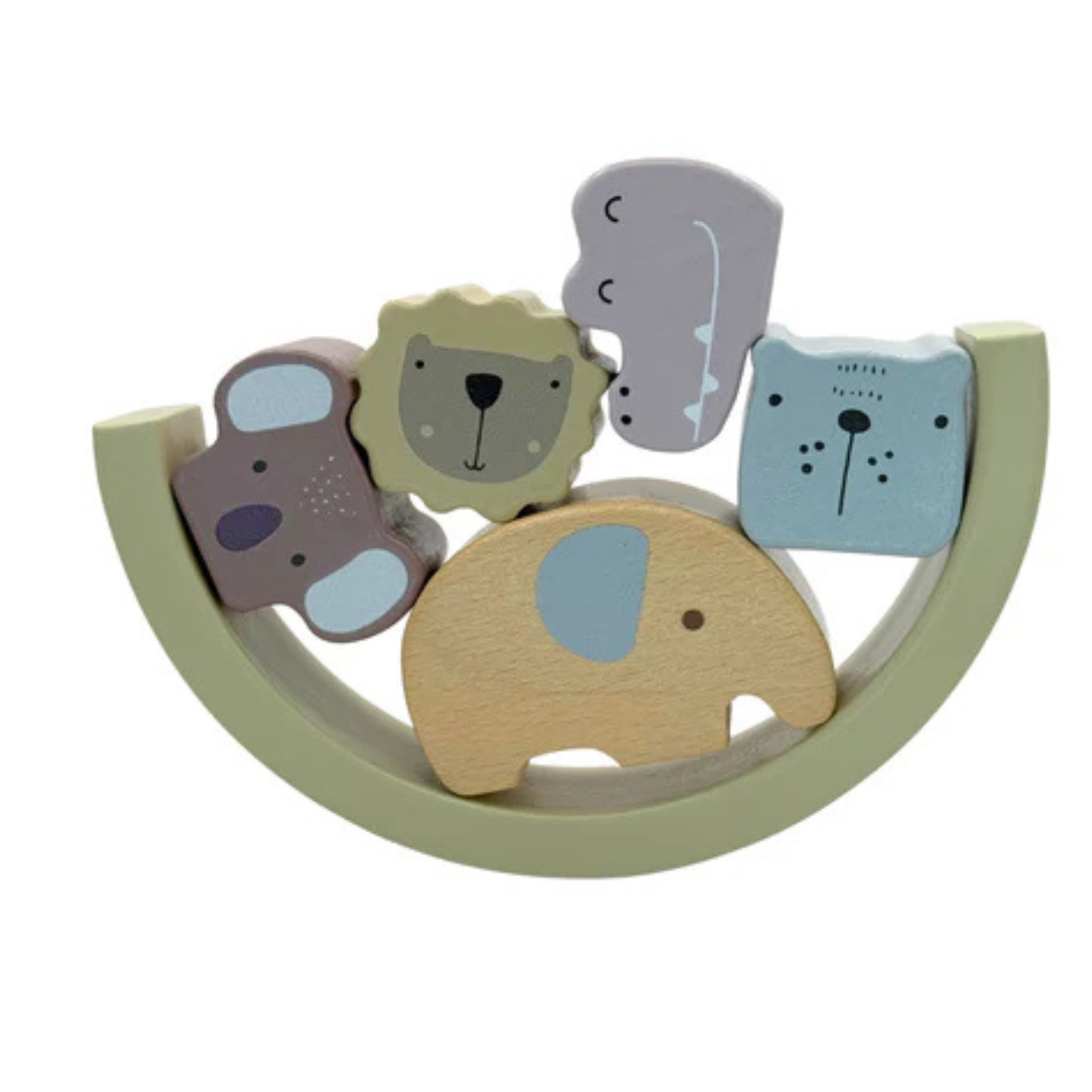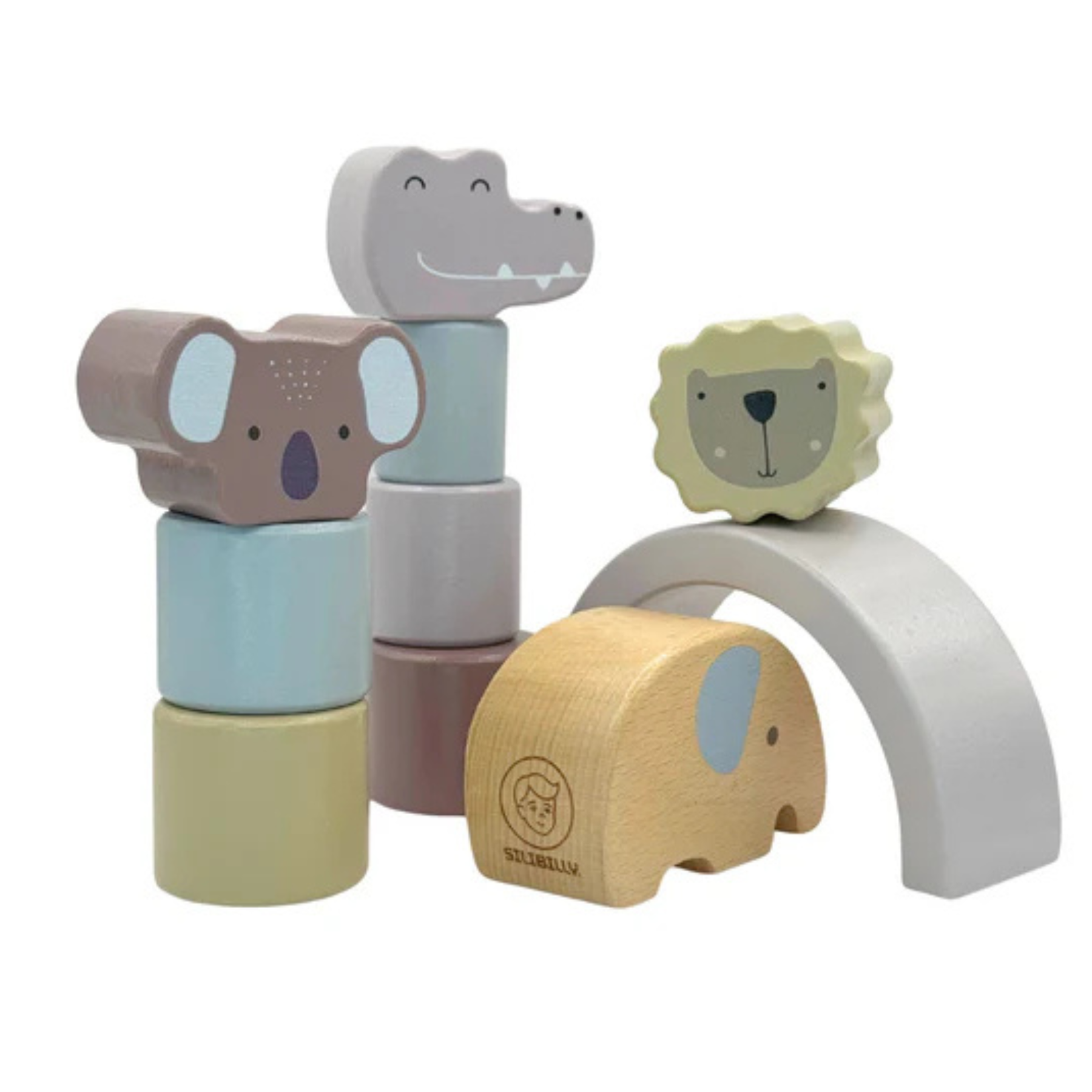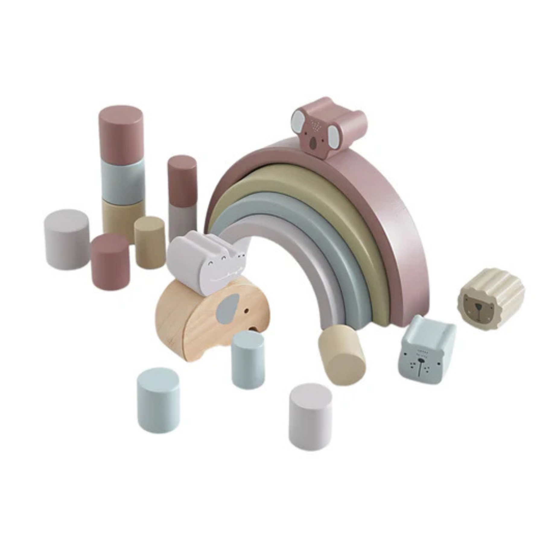 Animadera es un set de bloques 100% madera natural con formas de animales, arcoíris, cilindros y piezas geométricas para construir, apilar y crear.